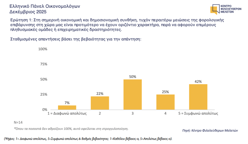 Πάνω από 6 στα 10 μέλη του Ελληνικού Πάνελ Οικονομολόγων του ΚΕΦίΜ προτείνουν οι τυχόν μελλοντικές φορολογικές ελαφρύνσεις να έχουν οριζόντιο αντί για στοχευμένο χαρακτήρα, σύμφωνα με τα αποτελέσματα της ερώτησης του Πάνελ για τον Δεκέμβριο.