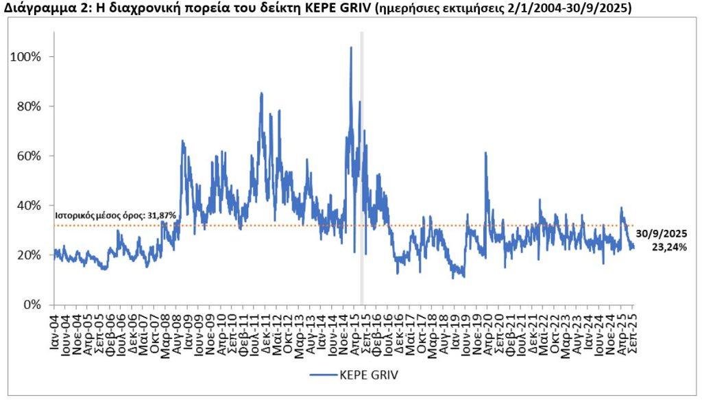 Στο 23,24% μειώθηκε η τιμή του δείκτη φόβου στις 30/9/2025 από το 23,50% στις 29/8/2025, σύμφωνα με το τελευταίο δελτίο Τύπου του ΚΕΠΕ.