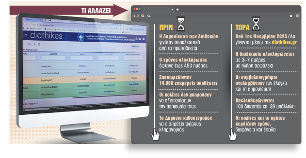 Με λίγα «κλικ» από τον ηλεκτρονικό υπολογιστή του σπιτιού τους, μέσα σε χρονικό διάστημα από 3 έως 7 ημέρες, θα μπορούν όλοι ανεξαιρέτως οι πολίτες από την 1η Νοεμβρίου 2025, μέσω της ψηφιακής πλατφόρμας diathikes.gr για ζητήματα με κληρονομιές, να έχουν στα χέρια τους δημοσιευμένη τη διαθήκη που τους αφορά και όλα τα σχετικά πιστοποιητικά.