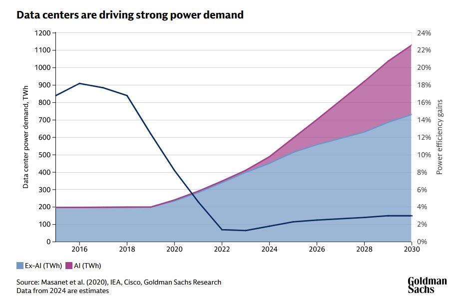 Η Goldman Sachs εκτιμά ότι η παγκόσμια ζήτηση για ενέργεια από τα data centers θα αυξηθεί κατά 175% έως το 2030, κυρίως λόγω της εξάπλωσης των εφαρμογών τεχνητής νοημοσύνης.