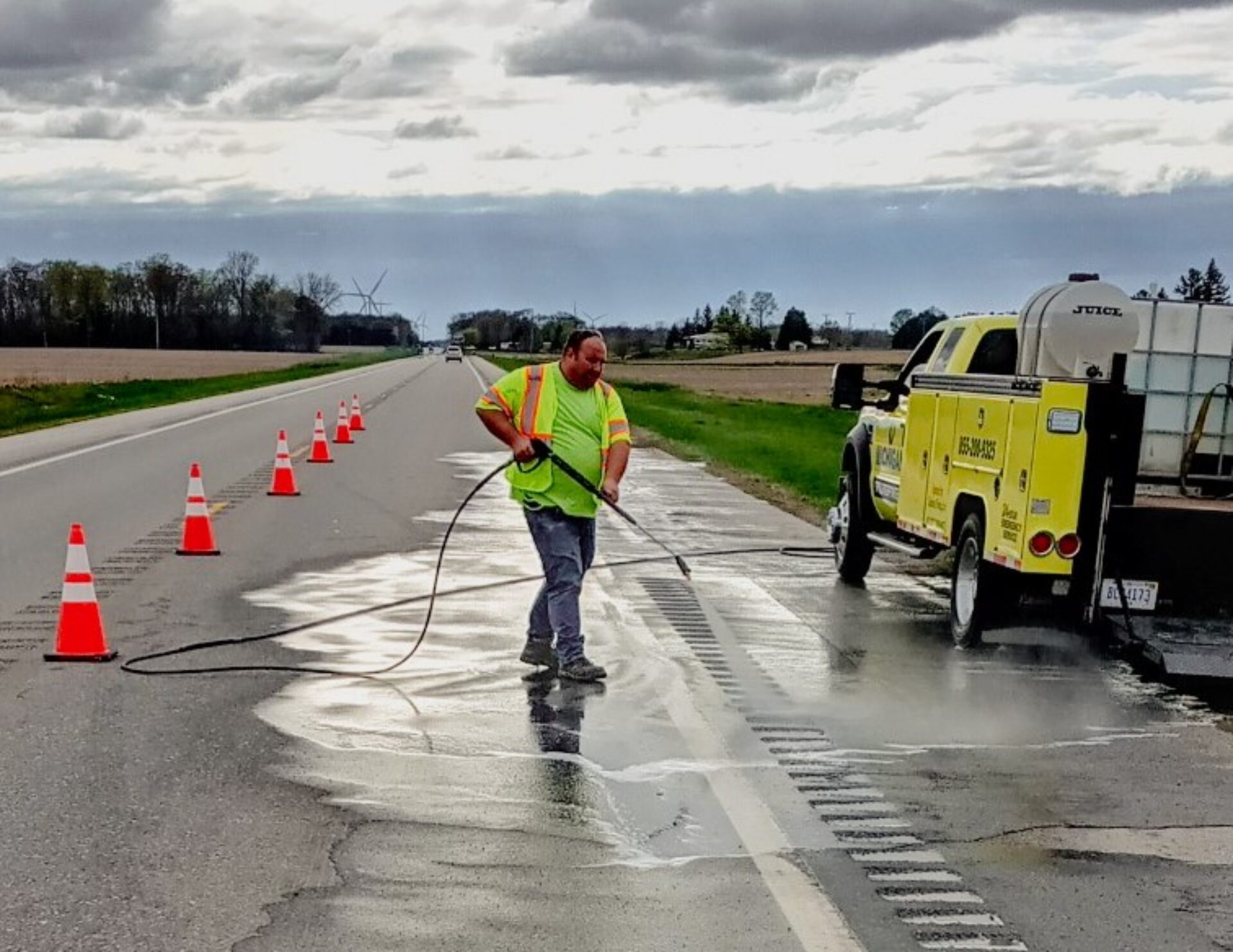 Αφού ρίξει το ειδικό υλικό στο οδόστρωμα για την