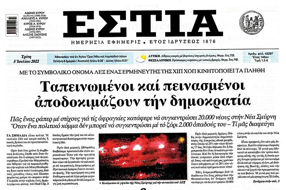 «Ταπεινωμένοι και πεινασμένοι αποδοκιμάζουν την δημοκρατία» αναφέρει το βασικός τίτλος, με τον υπέρτιτλο να αναφέρει: «Με το συμβολικό όνομα ΛΕΞ ένας ερμηνευτής της χιπ χοπ κινητοποιεί τα πλήθη», ενώ ο υπότιτλος λέει: «Πώς ένας ράπερ με στίχους για τις αφραγκίες κατάφερε να συγκεντρώσει 20.000 νέους στη Νέα Σμύρνη όταν ένα πολιτικό κόμμα δεν μπορεί να συγκεντρώσει με το ζόρι 2.000 οπαδούς του. Τι μας διαφεύγει». Αλλά ο ΛΕΞ δεν κατάφερε μόνο αυτό. Ο τελευταίος δίσκος του, «Μετρό», που κυκλοφόρησε στις 12 Μαΐου, απασχόλησε ακόμα και μέσα που δεν είχαν ασχοληθεί ποτέ με την ελληνική ραπ, παίχτηκε στο ραδιόφωνο και έγινε θέμα συζήτησης. Ακολουθεί ένα ρεκόρ, αφού, όταν ο ΛΕΞ κυκλοφόρησε τον Δεκέμβριο του 2024 τα νέα του τραγούδια, επικράτησε «χαμός» στα social media από τους θαυμαστές του, οι οποίοι τον αποθέωναν στις αναρτήσεις τους. Το άλμπουμ του με τίτλο «G.T.K.» έγινε χρυσό και, όπως είχε ενημερώσει η δισκογραφική του εταιρία Stay Independent στο Instagram, αυτό συνέβη στο πιο σύντομο χρονικό διάστημα στην ιστορία της ελληνικής δισκογραφίας, σπάζοντας ρεκόρ. Συνολικά, το άλμπουμ «G.T.K.» του ΛΕΞ είχε ξεπεράσει τα 25,5 εκατομμύρια streams στο Spotify.