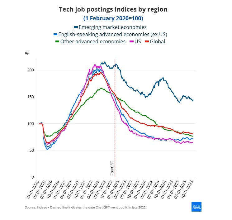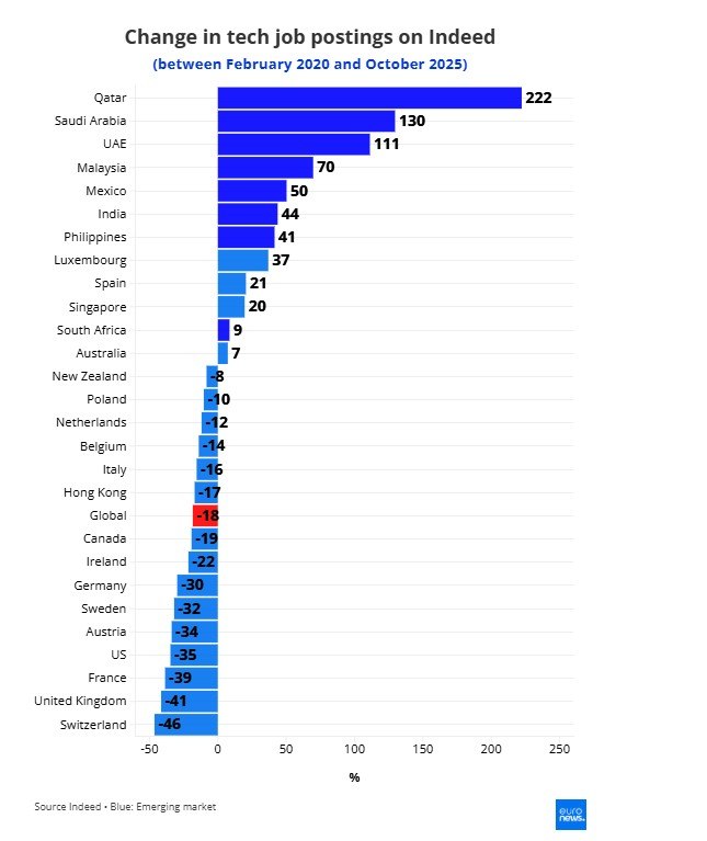 Οι ευρωπαϊκές χώρες είδαν απότομες μειώσεις στη ζήτηση εργαζομένων στον τεχνολογικό κλάδο από τις αρχές του 2020 έως και τα τέλη του 2025. Οι αγγελίες στην Indeed από την κορύφωσή τους στα τέλη του 2022, μειώνονται παγκοσμίως και μέχρι το 2025 οι σχετικές αναρτήσεις είχαν πέσει κάτω από τα προ πανδημίας επίπεδα παντού. Αυτό σε αντίθεση με αρκετές οικονομίες της Μέσης Ανατολής που έχουν παρουσιάσει ισχυρή ανάπτυξη τα τελευταία πέντε χρόνια.