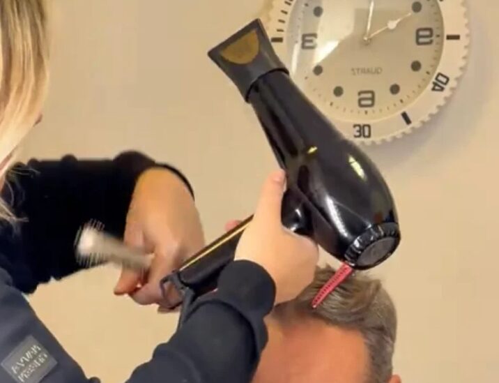Ακομπλεξαριστος με ένα ροζ τσιμπιδακι να του κρατά το μαλλι όσο του το χτενίζει η κομμώτρια