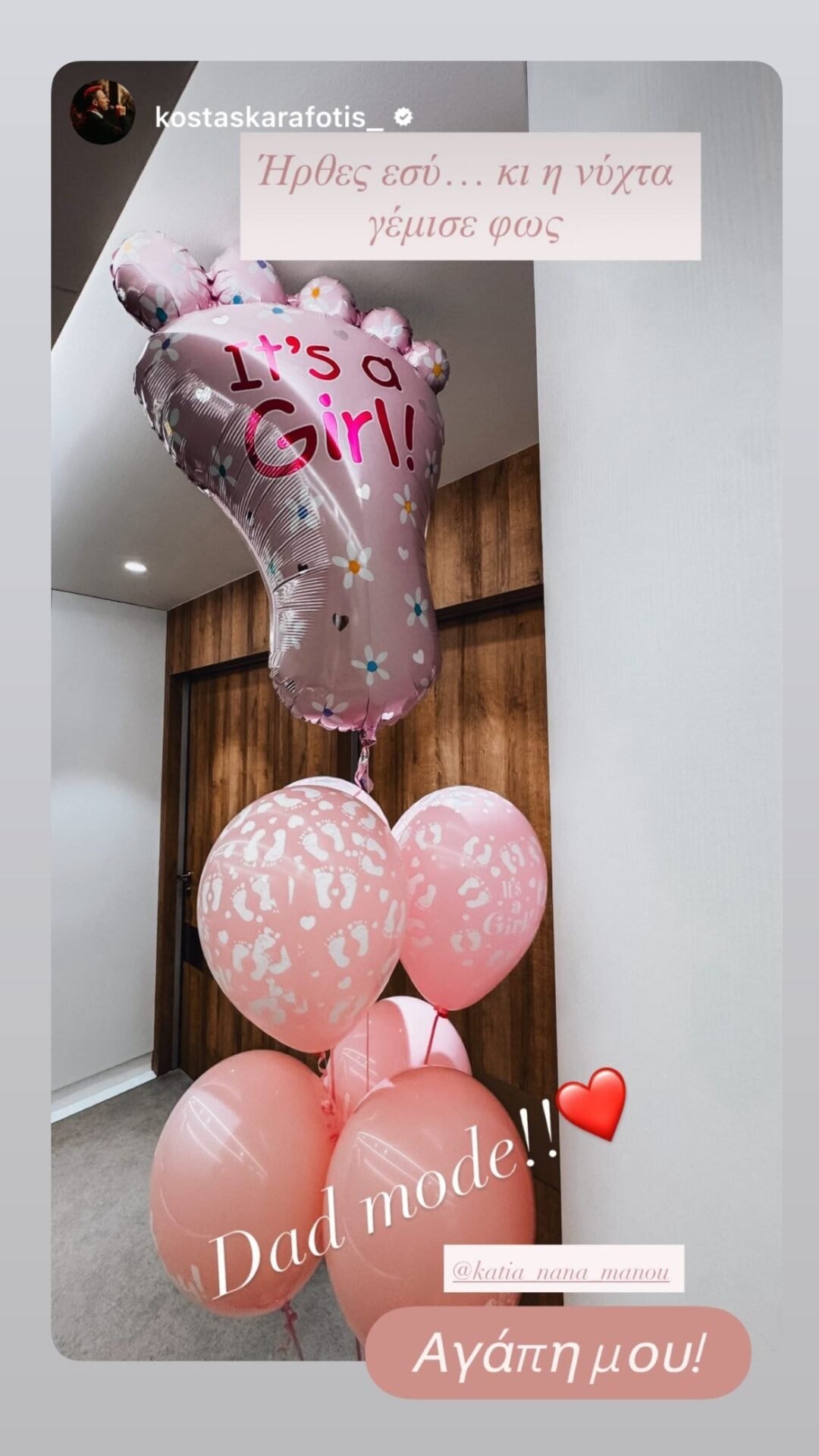 Το ζευγάρι υποδέχτηκε σήμερα (28/1) ένα υγιέστατο κοριτσάκι και ο τραγουδιστής μοιράστηκε τη χαρά του με τους διαδικτυακούς του φίλους, ανεβάζοντας φωτογραφία από το δωμάτιο του μαιευτηρίου με ροζ μπαλόνια.