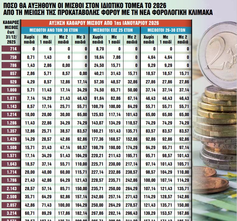 Αυξήσεις στα εισοδήματα που φθάνουν ακόμα και τους δύο μισθούς τον χρόνο φέρνει το 2026 σε εκατομμύρια μισθωτούς του ιδιωτικού και του δημόσιου τομέα η νέα φορολογική κλίμακα. Περισσότερο κερδισμένοι θα είναι οι νέοι εργαζόμενοι έως 30 ετών, όσοι έχουν παιδιά και οι μισθωτοί με μεσαία και υψηλότερα εισοδήματα.