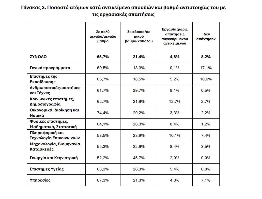 Προβληματισμό προκαλούν οι απαντήσεις των ερωτηθέντων στο κατά πόσο το αντικείμενο σπουδών τους αντιστοιχεί στις απαιτήσεις της εργασίας τους. Κατά μέσο όρο πάνω από ένας στους τρεις νέους απασχολείται σε επαγγέλματα και θέσεις εργασίας που δεν αντιστοιχούν ή αντιστοιχούν σε μικρό βαθμό σε αυτό που σπούδασε.