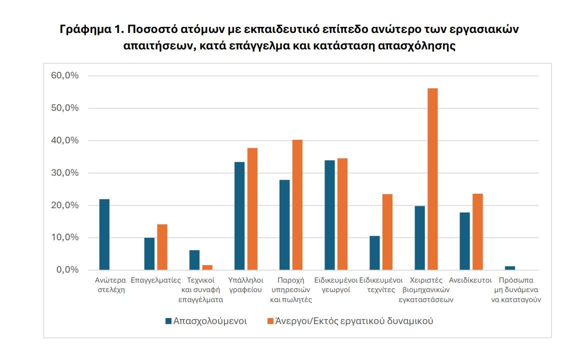 Σύμφωνα με την ΕΛΣΤΑΤ, πάνω από 20% των νέων που εργάζονται ή που αναζητούν εργασία έχουν περισσότερα εκπαιδευτικά προσόντα από αυτά που απαιτούν οι δουλειές που είναι διαθέσιμες.
