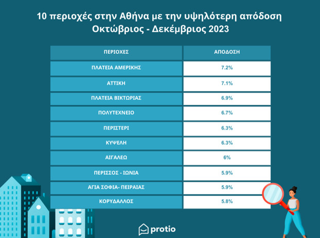 Η έρευνα επικεντρώθηκε στην απόδοση των επενδύσεων σε διαφορετικές περιοχές, εστιάζοντας στην εκτίμηση της αξίας των ακινήτων και των δυνητικών εισοδημάτων από μισθώματα. Απο τα τελευταία δεδομένα της Protio, πλέον στην κορυφή της λίστας βρίσκεται η Πλατεία Αμερικής με απόδοση 7,2%, έναντι του προηγούμενου εξαμήνου που τη πρωτιά είχε το Αιγάλεω με 8,2% απόδοση, ξεχωρίζοντας ως μια από τις πιο ελκυστικές περιοχές για επενδύσεις.