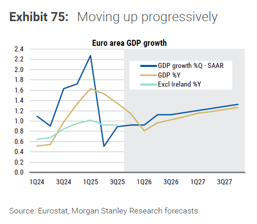 Η Morgan Stanley επισημαίνει ότι οι ετήσιοι ρυθμοί ανάπτυξης του 2025 είναι παραπλανητικά υψηλοί, κυρίως λόγω της εξαιρετικής δυναμικής της Ιρλανδίας στο πρώτο εξάμηνο. Εξαιρώντας την Ιρλανδία, η πραγματική ανάπτυξη στην ευρωζώνη δεν ξεπερνά το 1%.