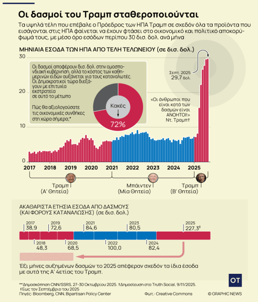 Οι υψηλοί δασμοί που επέβαλε ο Πρόεδρος των ΗΠΑ Τραμπ σε σχεδόν όλα τα προϊόντα που εισάγονται στις Ηνωμένες Πολιτείες φαίνεται να έχουν φτάσει στο οικονομικό και πολιτικό τους αποκορύφωμα, με μέσο όρο εσόδων περίπου 30 δισεκατομμύρια δολάρια κάθε μήνα.