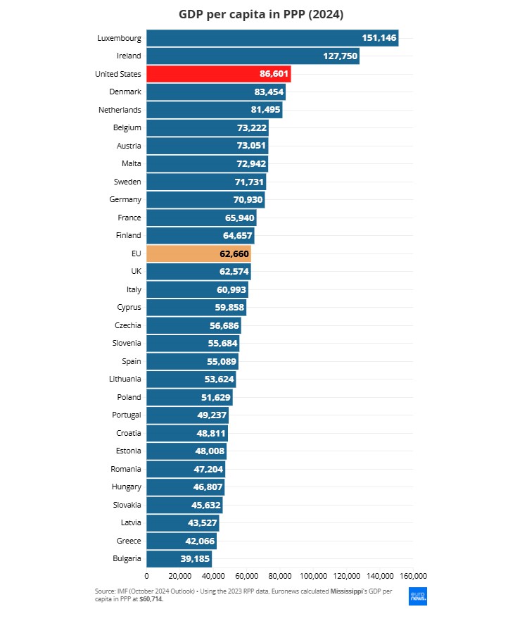 Ωστόσο, σημειώνει ο καθηγητής, «η μέση φτώχεια είναι αισθητά υψηλότερη, παρότι τα μέσα εισοδήματα υπερβαίνουν εκείνα των περισσότερων χωρών της Δυτικής Ευρώπης». Όταν συγκρίνεται το κατά κεφαλήν ΑΕΠ με την Ευρώπη, προκύπτει ένα εντυπωσιακό συμπέρασμα: η φτωχότερη πολιτεία των ΗΠΑ ανταγωνίζεται τη Γερμανία. Το τρίτο τρίμηνο του 2024, το Μισισίπι κατέγραψε κατά κεφαλήν ΑΕΠ 49.780 ευρώ (53.872 δολάρια), έναντι 51.304 ευρώ στη Γερμανία, μια διαφορά μόλις περίπου 1.500 ευρώ.