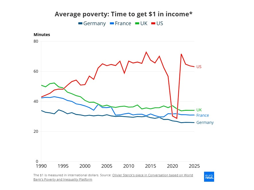 Το 2025, στις ΗΠΑ απαιτούνται 63 λεπτά για την απόκτηση ενός δολαρίου. Στη Γερμανία ο αντίστοιχος χρόνος είναι 26 λεπτά, στη Γαλλία 31 λεπτά και στο Ηνωμένο Βασίλειο 34 λεπτά. Τα νούμερα υποδεικνύουν ότι η μέση φτώχεια στις ΗΠΑ είναι περίπου διπλάσια σε σύγκριση με τις τρεις αυτές ευρωπαϊκές χώρες.