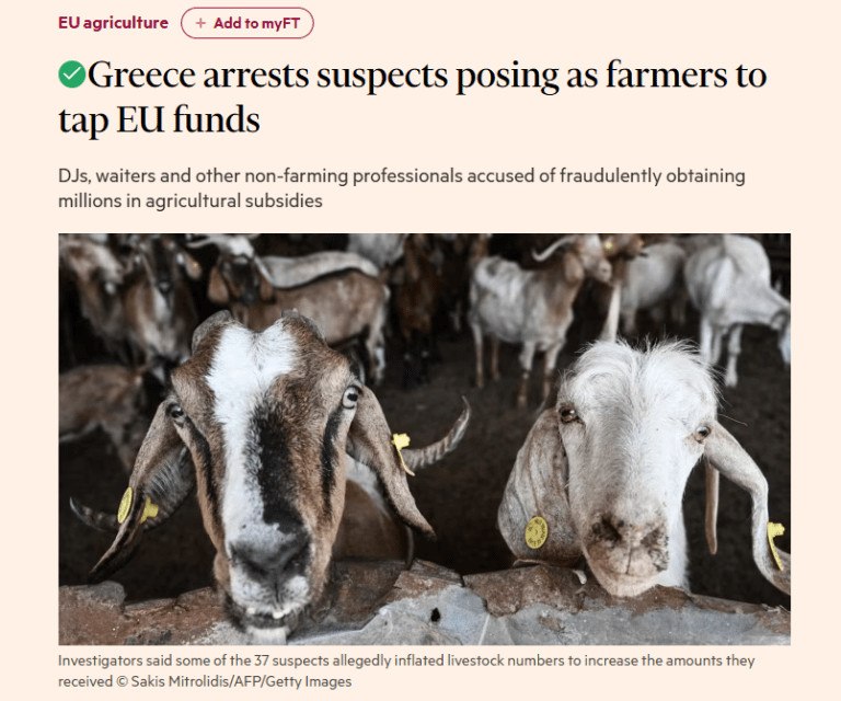 Οι FT υπογραμμίζουν ότι ελληνική αστυνομία συνέλαβε δεκάδες υπόπτους που κατηγορούνται ότι παρίσταντο ως αγρότες για να αποκτήσουν δόλια πρόσβαση σε εκατομμύρια από τα γεωργικά κονδύλια της ΕΕ, τα οποία στη συνέχεια ξόδεψαν σε είδη πολυτελείας και ταξίδια.