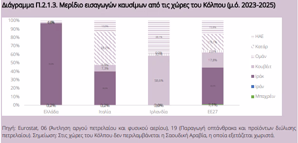 Η Ελλάδα είναι η χώρα με τη μεγαλύτερη εξάρτηση σε εισαγωγές ενεργειακών προϊόντων από τις χώρες του Κόλπου, με το 25,4% των εισαγωγών της χώρες σε όρους αξίας να προέρχεται από τη συγκεκριμένη περιοχή, ενώ ακολουθεί η Ιταλία με 9,5% και η Ιρλανδία με 9,1%. Ο μέσος όρος της ΕΕ27 είναι στο 6,1%, παρουσιάζοντας συνολικά σχετικά μικρή εξάρτηση ως ΕΕ από την περιοχή.