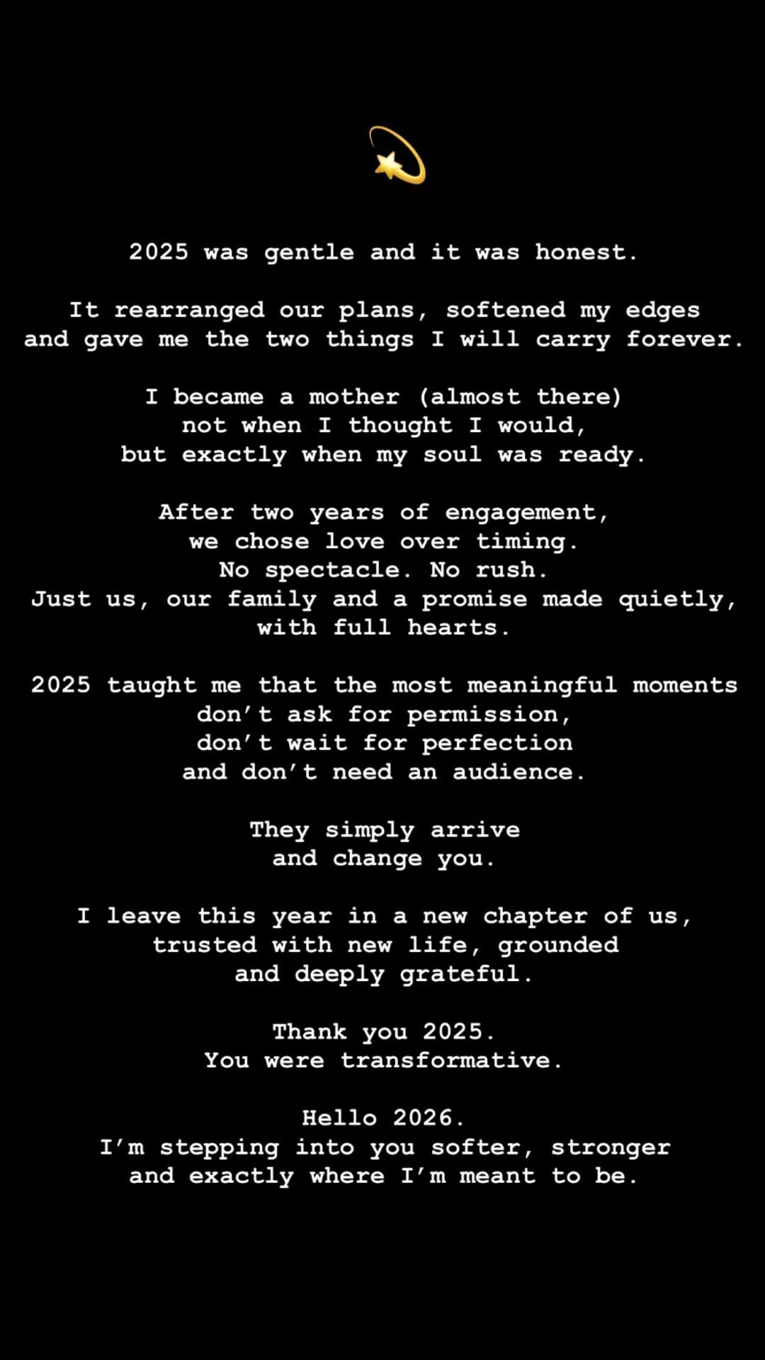Η ίδια αποκάλυψε το χαρμόσυνο γεγονός μέσα από φωτογραφίες στα Instagram stories, λίγο πριν το τέλος του 2025, δείχνοντας πως η εγκυμοσύνη της χάρισε λίγη περισσότερη λάμψη.