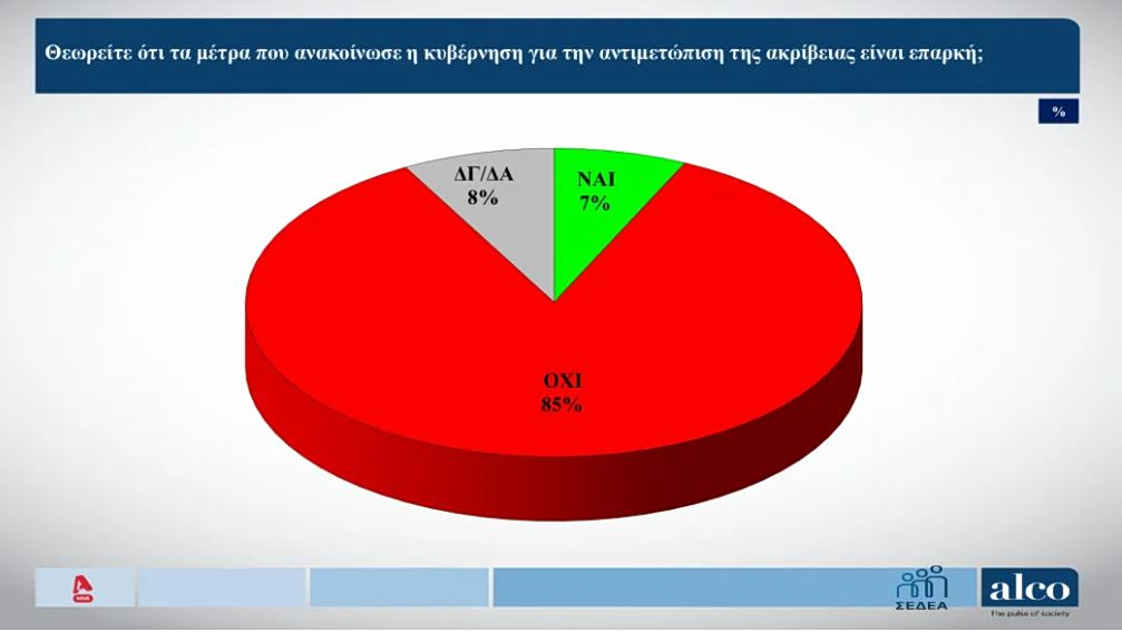 Την ίδια ώρα, η συντριπτική πλειονότητα- το 85% των ερωτηθέντων στη δημοσκόπηση- απαντά ότι δεν είναι επαρκή τα μέτρα της κυβέρνησης για την αντιμετώπιση της ακρίβειας.