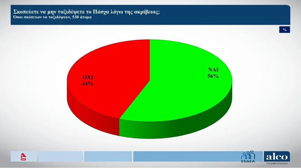 Πίσω στη δημοσκόπηση, με την ακρίβεια να δείχνει τα «δόντια της», το 56% δηλώνει ότι δεν θα ταξιδέψει το φετινό Πάσχα, ενώ το 44% λέει το αντίθετο.