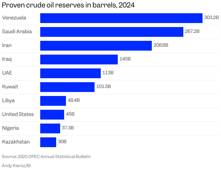 Η Βενεζουέλα διαθέτει πάνω από 300 δισεκατομμύρια βαρέλια αποδεδειγμένων αποθεμάτων αργού πετρελαίου — περισσότερα από οποιαδήποτε άλλη χώρα στον κόσμο.