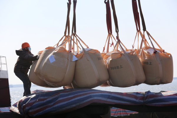 Εργάτης φορτώνει λιπάσματα για εξαγωγή. Κι αυτά θα ακριβύνουν λόγω φόρου άνθρακα