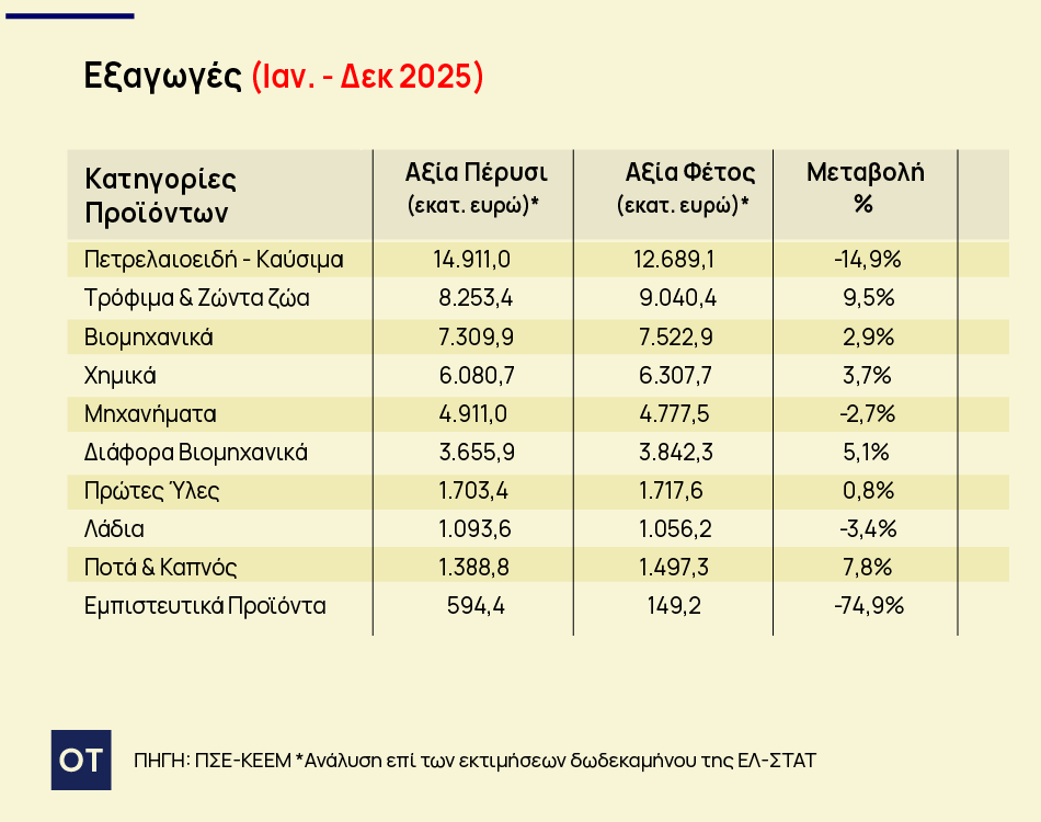Σε επίπεδο δωδεκαμήνου (Ιανουάριος–Δεκέμβριος 2025), οι εξαγωγές, συμπεριλαμβανομένων των πετρελαιοειδών, μειώθηκαν κατά 2,8% και διαμορφώθηκαν στα 48,60 δισ. ευρώ, μειωμένες κατά 1,40 δισ. ευρώ σε σχέση με το 2024. Αντίθετα, χωρίς τα πετρελαιοειδή, οι εξαγωγές αυξήθηκαν κατά 2% ή κατά 725,6 εκατ. ευρώ, φθάνοντας τα 36,92 δισ. ευρώ.