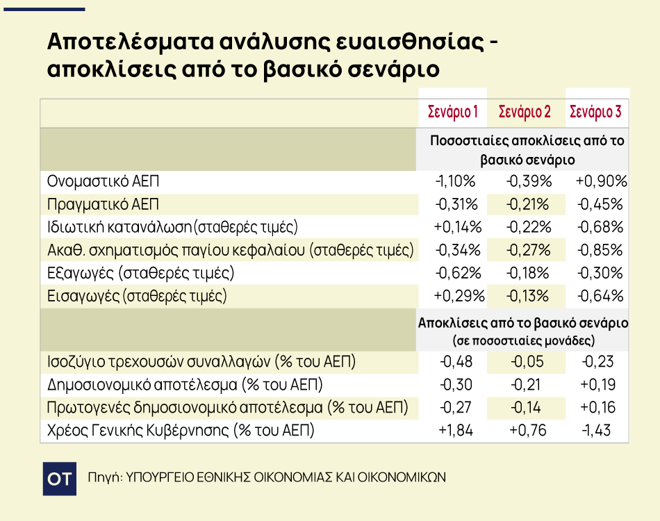 Η συγκεκριμένη ανάλυση ευαισθησίας που πραγματοποιήθηκε από το ελληνικό υπουργείο Εθνικής Οικονομίας και Οικονομικών αποσκοπεί στην εκτίμηση της πορείας των κύριων μακροοικονομικών και δημοσιονομικών μεταβλητών κάτω από διαφορετικά εναλλακτικά σενάρια, τα οποία αφορούν στην υλοποίηση κάποιων εκ των υφιστάμενων κινδύνων. Συγκεκριμένα, εξετάζονται τρία εναλλακτικά σενάρια, τα οποία υπολογίστηκαν με την χρήση του Oxford Economic Model. Τ