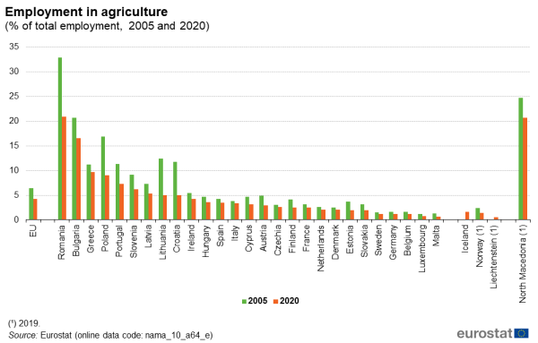 Με βάση τις απογραφές πληθυσμού της Eurostat oι απασχολούμενοι στον αγροτικό τομέα στην Ελλάδα (γεωργία-κτηνοτροφία), αποτελούν το 9,7% του συνόλου των απασχολούμενων. Είναι το τρίτο υψηλότερο ποσοστό στην ΕΕ, μετά τη Ρουμανία και τη Βουλγαρία.