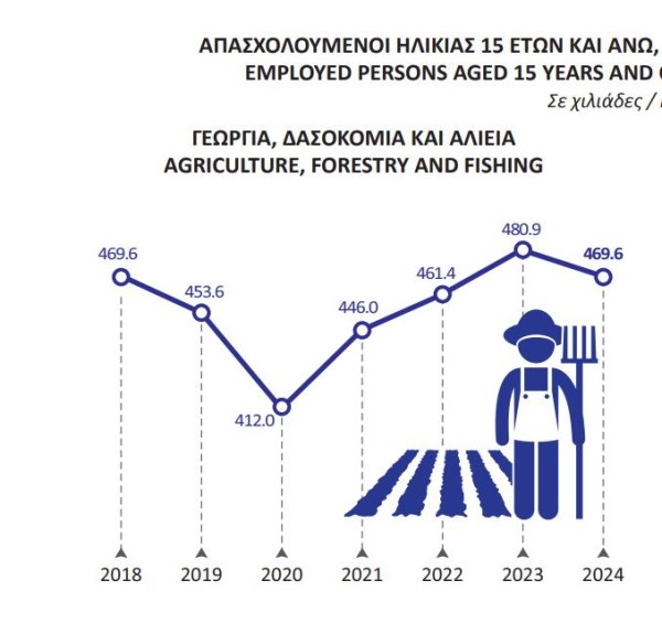 Στα νέα επικαιροποιημένα στοιχεία της EΛΣΤΑΤ (9/1/2026) οι απασχολούμενοι σε γεωργία-αλιεία-δασοκομία υπολογίζονται σε 469.000 άτομα.
