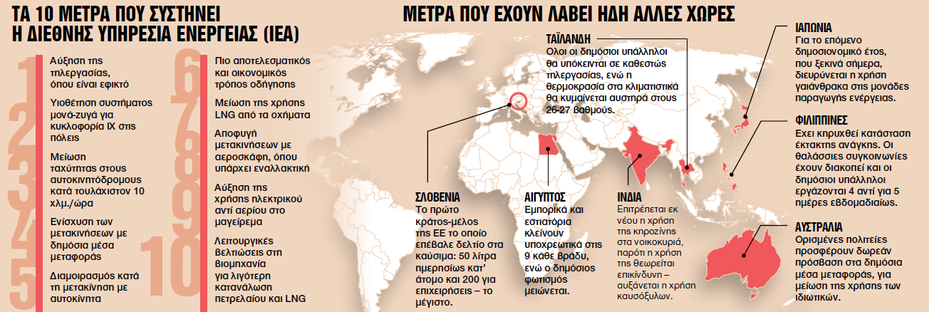Παράλληλα, έσπευσε να υιοθετήσει το σύνολο σχεδόν του «Σχεδίου Δέκα Σημείων» που διατύπωσε πριν από μερικές ημέρες η Διεθνής Υπηρεσία Ενέργειας (ΙΕΑ). Ανάμεσά τους, την τηλεργασία όπου είναι εφικτό, τη μείωση της ανώτατης ταχύτητας στους αυτοκινητόδρομους, τις μετακινήσεις με δημόσια και όχι ιδιωτικά μέσα, τον διαμοιρασμό ώστε με κάθε όχημα να μετακινούνται περισσότεροι άνθρωποι και άλλα σχετικά.
