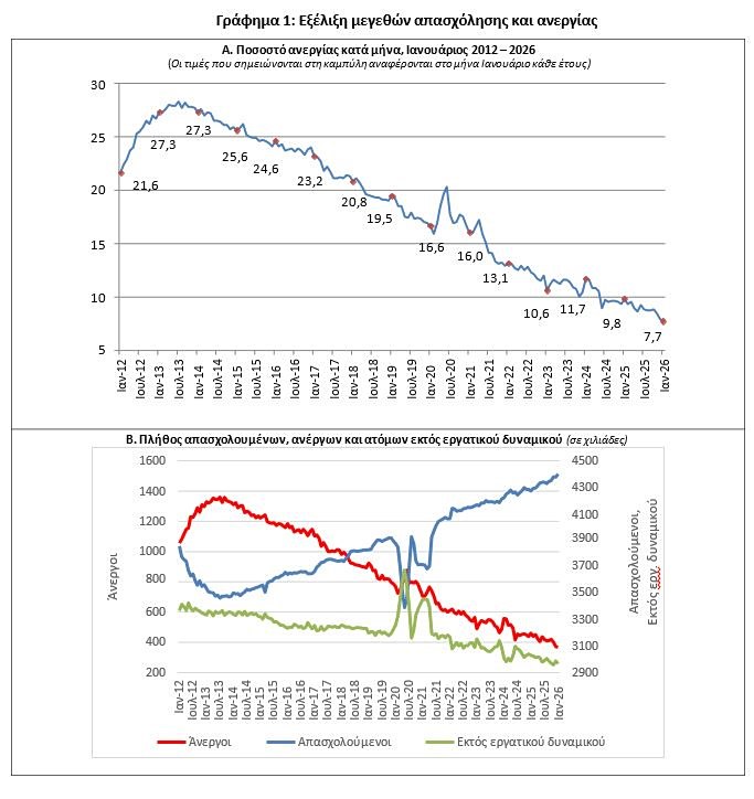 Οι άνεργοι ανήλθαν σε 369.146 άτομα σημειώνοντας μείωση κατά 92.711 άτομα σε σχέση με τον Ιανουάριο του 2025 (-20,1%) και μείωση κατά 3.907 άτομα σε σχέση με τον Δεκέμβριο του 2025 (-1,0%).