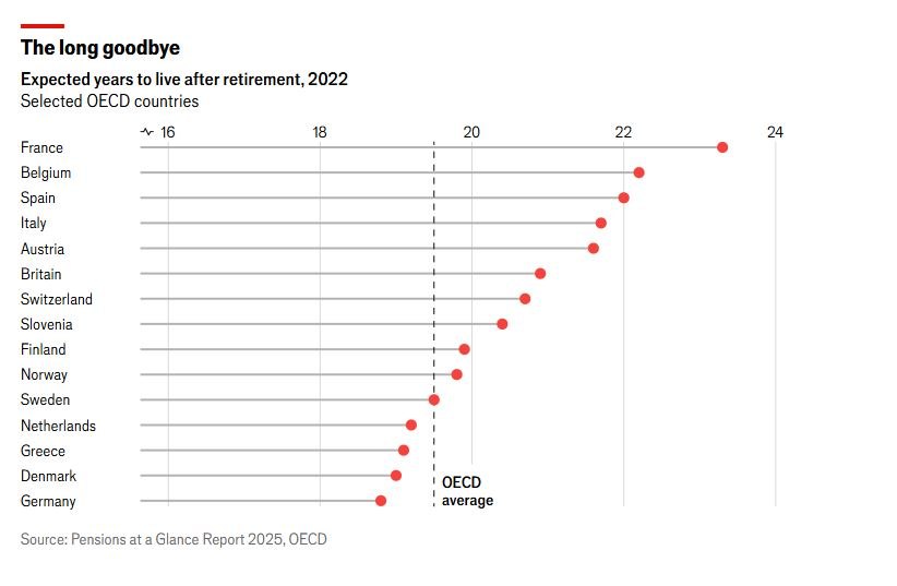 Οι χώρες που γερνούν πιο γρήγορα προσφέρουν ήδη από τις πιο γενναιόδωρες συντάξεις και χαμηλά όρια συνταξιοδότησης. Ο μέσος Γάλλος συνταξιούχος λαμβάνει σύνταξη επί 23 χρόνια — περισσότερο από κάθε άλλη χώρα του ΟΟΣΑ. Στη Δανία, ο μέσος όρος είναι 19 χρόνια, ενώ η κυβέρνηση σχεδιάζει να αυξήσει την ηλικία συνταξιοδότησης στα 70 έως το 2040, την υψηλότερη στην Ευρώπη.