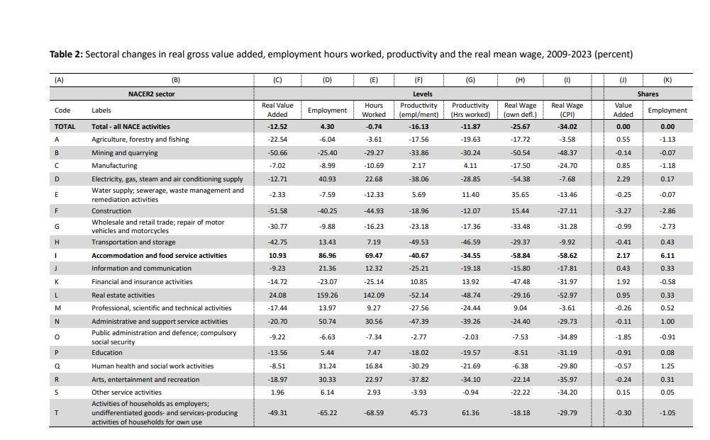 Ενώ ο κλάδος της εστίασης και των καταλυμάτων διογκώθηκε σε αριθμό απασχολούμενων, καθαρή προστιθέμενη αξία και μερίδιο στην παραγωγή, η παραγωγικότητά του, που ήταν ήδη χαμηλή, κατέρρευσε. Αυτό συνέβη με ρυθμό πολύ ταχύτερο από το σύνολο της οικονομίας.