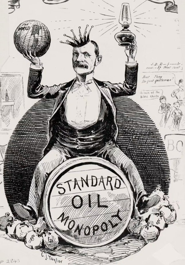 Καρτούν που απεικονίζει τον πρόεδρο της Standard Oil, John D. Rockefeller, ως τον «βασιλιά του κόσμου». (Αρχείο Bettmann)