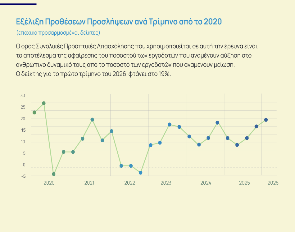 Σύμφωνα με τη νέα Έρευνα Προοπτικών Απασχόλησης του ομίλου ManpowerGroup για το 1ο τρίμηνο του 2026, 520 Έλληνες εργοδότες – που συμμετείχαν στην έρευνα – αναμένουν περαιτέρω άνοδο των επιπέδων στελέχωσης, με τον δείκτη Προοπτικών Απασχόλησης (NEO) να διαμορφώνεται στις 19 μονάδες, αυξημένο κατά 3 μονάδες σε σχέση με το προηγούμενο τρίμηνο και κατά 8 μονάδες σε ετήσια βάση.