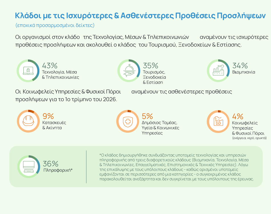 - Οι πιο αισιόδοξες προοπτικές πρόσληψης καταγράφονται στους κλάδους των Χρηματοοικονομικών και Ασφαλειών (32%), της Τεχνολογίας, των Μέσων & Τηλεπικοινωνιών (29%) και των Κατασκευών και Ακινήτων (27%).