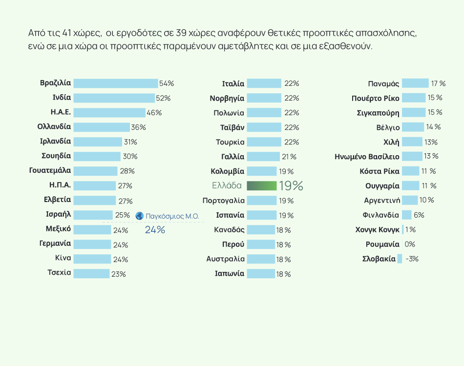 - H Βραζιλία (54%) καταγράφει το υψηλότερο ποσοστό στις προθέσεις προσλήψεων παγκοσμίως.