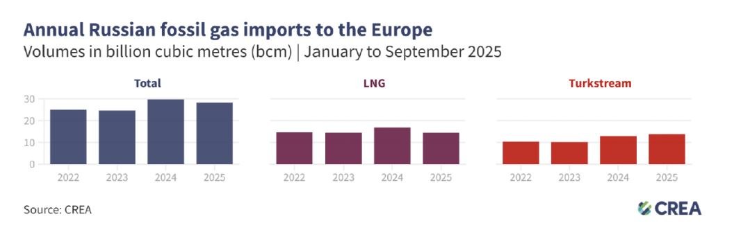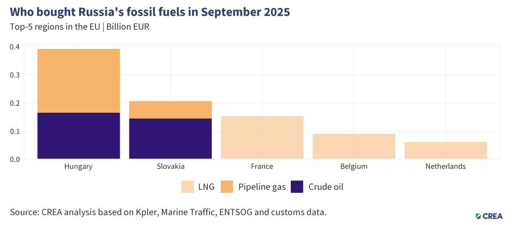 Τον Σεπτέμβριο του 2025, οι πέντε μεγαλύτεροι εισαγωγείς ρωσικών ορυκτών καυσίμων στην ΕΕ κατέβαλαν στη Ρωσία συνολικά 906 εκατ. ευρώ για ορυκτά καύσιμα. Τα δύο τρίτα των εισαγωγών αυτών αντιστοιχούσαν στο φυσικό αέριο το οποίο παραδόθηκε κυρίως μέσω αγωγών ή ως υγροποιημένο φυσικό αέριο (LNG). Το υπόλοιπο ήταν σε μεγάλο βαθμό αργό πετρέλαιο, το οποίο συνεχίζει να ρέει στην Ουγγαρία και τη Σλοβακία μέσω του νότιου κλάδου του αγωγού Druzhba.