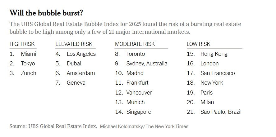 Ο παγκόσμιος δείκτης φούσκας ακινήτων της UBS για το 2025 διαπίστωσε ότι ο κίνδυνος να σκάσει μια φούσκα ακινήτων είναι υψηλός μόνο σε λίγες από τις 21 μεγάλες διεθνείς αγορές.