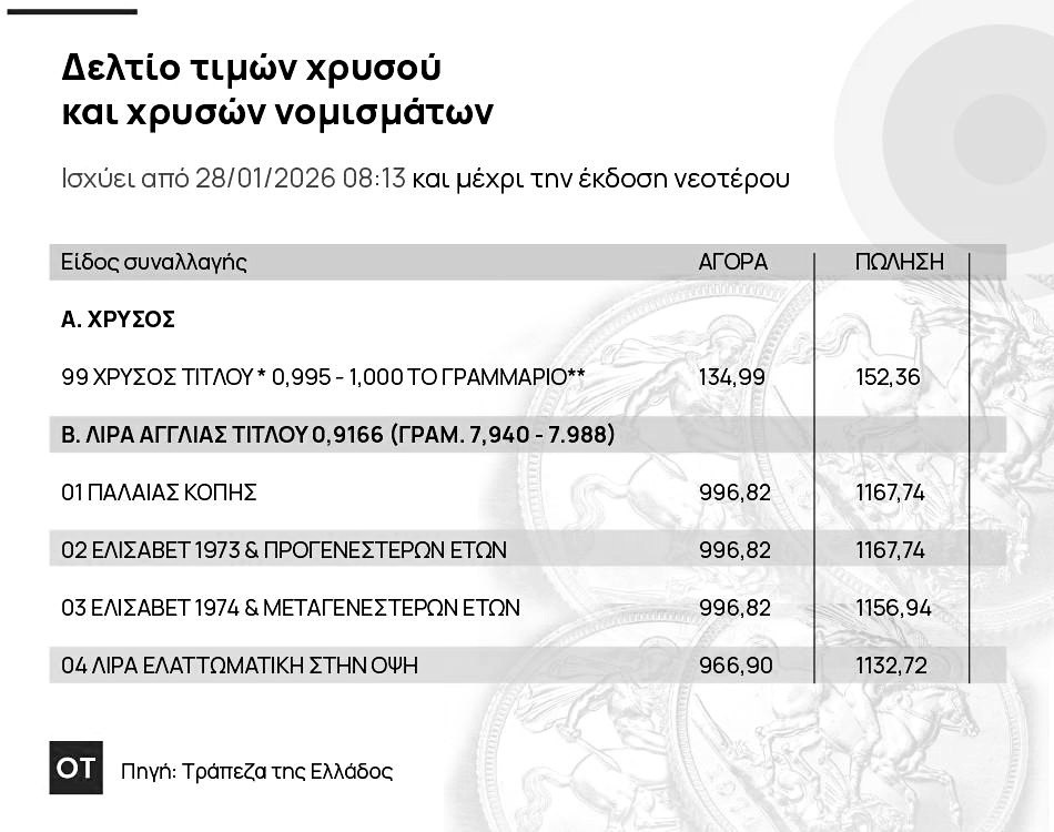 Η τιμή της χρυσής λίρας καταγράφει ράλι στην εγχώρια αγορά τους τελευταίους 13 μήνες, ξεπερνώντας το φράγμα των 1.000 ευρώ και ανεβάζοντας στις 27 Ιανουαρίου η τιμή αγοράς της χρυσής λίρας, από την ΤτE, ήταν στα 971,84 ευρώ και η τιμή πώλησης στα 1.138,5 ευρώ.