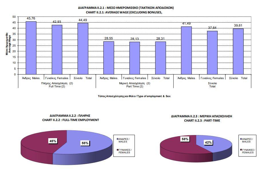 Ο μέσος μισθός στις γυναίκες ήταν σαφώς μικρότερος, στα 1271,66 ευρώ ενώ στους άνδρες ήταν 1461,95 ευρώ, ενώ το μέσο ημερομίσθιο ήταν αντίστοιχα 54,76 ευρώ και 62,67 ευρώ.