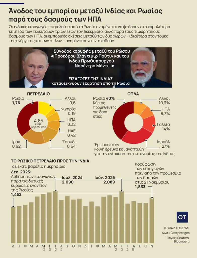 Ιδιαίτερη βαρύτητα και για τις δυο χώρες έχουν οι εισαγωγές πετρελαίου της Ινδίας απο τη Ρωσία καθώς αποτελούν και τη βασική «εστία» που πυροδοτεί την εμπορική αντιπαράθεση ανάμεσα στις Ηνωμένες Πολιτείες και το Νέο Δελχί. Αλλωστε, η Ινδία αντιμετωπίζει τιμωρητικούς δασμούς 50% που εξήγγειλε ήδη απο τον Αύγουστο ο Αμερικανός πρόεδρος Ντόναλντ Τραμπ.