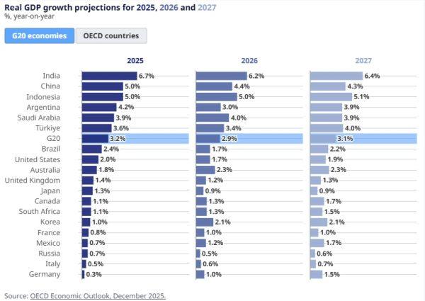 Για την Ινδία, οι εισαγωγές ρωσικού πετρελαίου σε χαμηλές τιμές είναι το βασικό «καύσιμο» για μια οικονομία που αναπτύσεται με εντυπωσιακούς ρυθμούς: Σύμφωνα με τον ΟΟΣΑ η Ινδία είναι μακράν η πρώτη χώρα σε ρυθμούς ανάπτυξης με 6,7%, όπως φαίνεται και στον πίνακα.