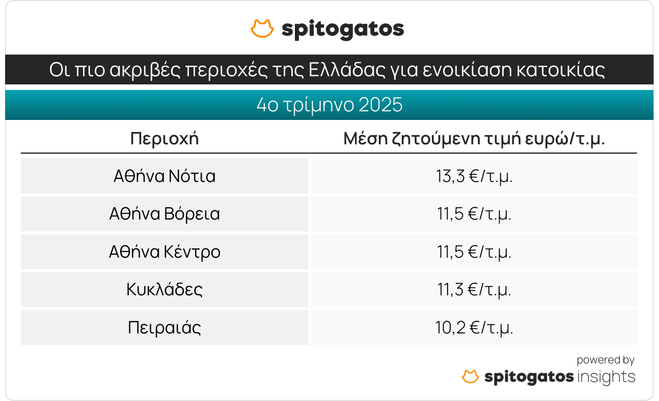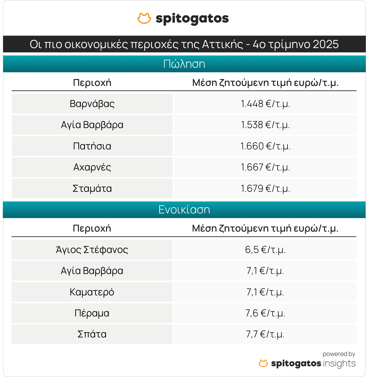 Οι πιο οικονομικές περιοχές για ενοικίαση κατοικίας στην Αττική κατά το 4ο τρίμηνο του 2025 είναι ο Άγιος Στέφανος στα Βόρεια Προάστια της Αθήνας, με ΜΖΤ στα 6,5 ευρώ/τ.μ., η Αγία Βαρβάρα και το Καματερό στα Δυτικά Προάστια, το Πέραμα στα Προάστια του Πειραιά και τα Σπάτα στην Ανατολική Αττική.