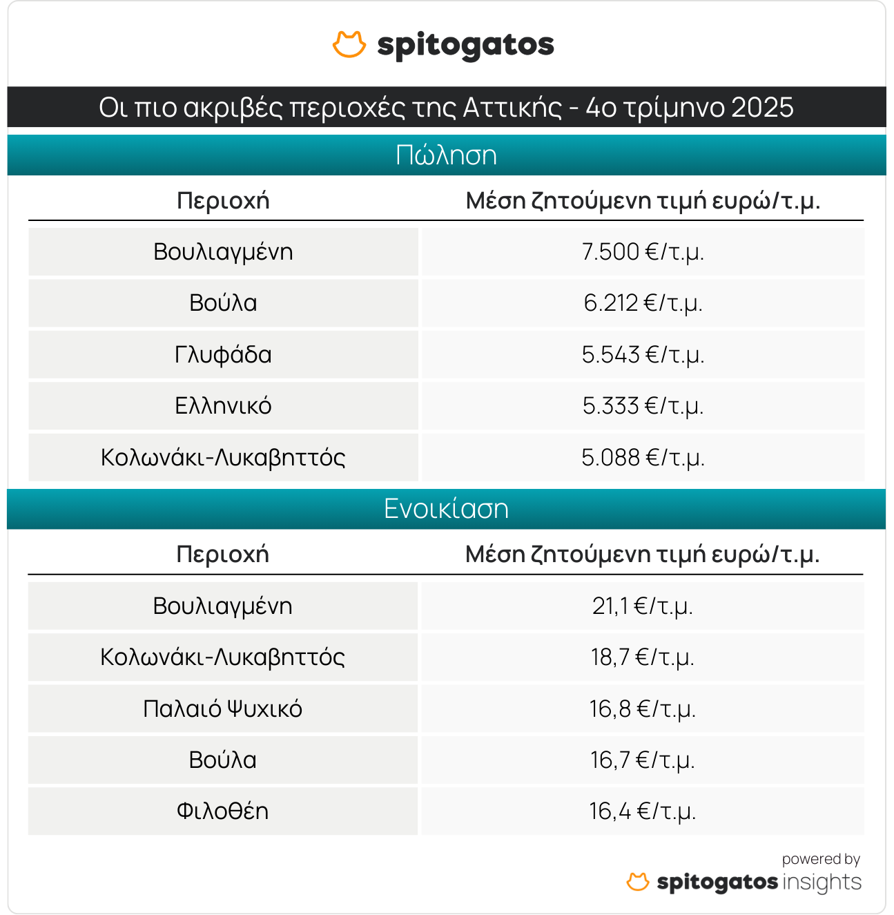 Σε ό,τι αφορά την ενοικίαση κατοικίας, και για το 4ο τρίμηνο του 2025, η Βουλιαγμένη αναδεικνύεται ως η ακριβότερη περιοχή της Αττικής, με ΜΖΤ ενοικίασης στα 21,1 ευρώ/τ.μ., τιμή αυξημένη κατά 5,7% σε σύγκριση με το 4ο τρίμηνο του 2024. Ακολουθούν οι περιοχές Κολωνάκι-Λυκαβηττός, Παλαιό Ψυχικό, Βούλα και Φιλοθέη, με ΜΖΤ που διαμορφώνεται στα 16,4 ευρώ/τ.μ. Στη Φιλοθέη καταγράφεται μείωση -8,0% σε ετήσια βάση, ενώ οι υπόλοιπες περιοχές της πρώτης πεντάδας σημειώνουν ετήσιες αυξήσεις που κυμαίνονται μεταξύ 2,9% και 12,0%.