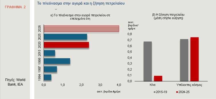 Η Παγκόσμια Τράπεζα (Commodity Markets Outlook, October 2025) εκτιμά ότι η ζήτηση πετρελαίου αυξήθηκε μόνο κατά 0,8 εκατ. βαρέλια την ημέρα (0,7% σε ετήσια βάση) το τρίτο τρίμηνο του 2025, αντανακλώντας υποτονικότερη ζήτηση σε σχέση με τα προηγούμενα έτη. Ειδικά, όσον αφορά την Κίνα που είναι από τους μεγαλύτερους καταναλωτές ενέργειας παγκοσμίως, τα τελευταία δύο χρόνια, η αύξηση της ζήτησης πετρελαίου ήταν σημαντικά χαμηλότερη από τον μέσο όρο της περιόδου 2015-19, επηρεάζοντας πτωτικά τις τιμές του, ενώ η αύξηση στον υπόλοιπο κόσμο παρέμεινε σε γενικές γραμμές σταθερή (Γράφημα 2β). Η τάση αυτή αναμένεται να συνεχισθεί και το 2026, δηλαδή η κατανάλωση πετρελαίου στις προηγμένες οικονομίες προβλέπεται να παραμείνει σχετικά σταθερή, ενώ η αύξηση στην Κίνα θα είναι πιθανώς μέτρια, λόγω και της επιταχυνόμενης υιοθέτησης ηλεκτρικών και υβριδικών οχημάτων.
