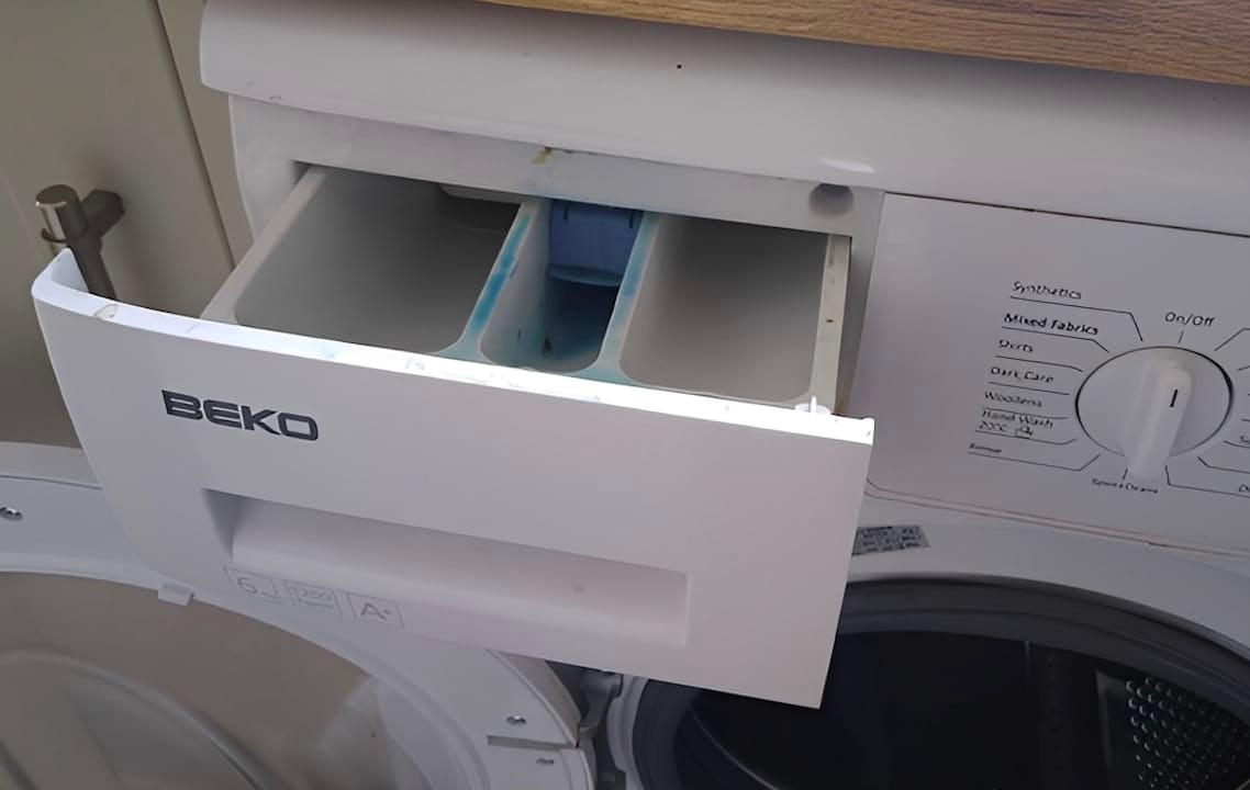 Πατώντας το κουμπί, δείχνει πως κρύβει από κάτω μία αποσπώμενη θήκη, η οποία συγκεντρώνει μούχλα και υγρασία από το μαλακτικό που «ξεμένει» στο μηχάνημα. Το μόνο που έχετε να κάνετε είναι να καθαρίσετε καλά αυτή τη θήκη, τα τη ξαναβάλετε στη θέση της, και voila, μόλις ξεφορτωθήκατε την επίμονη «μουχλίλα».