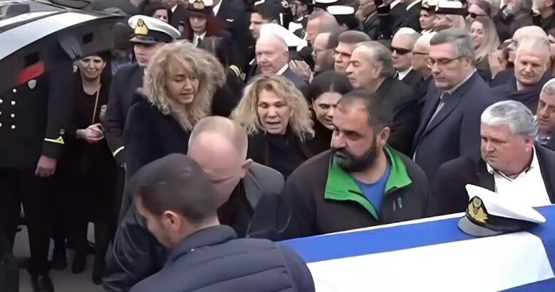 Τραγική φιγούρα η σύζυγος του λιμενικού, η οποία λύγισε και ξέσπασε σε κλάματα αγκαλιάζοντας το φέρετρο του αδικοχαμένου συζύγου της, το οποίο ήταν τυλιγμένο με την ελληνική σημαία σύμφωνα με το notospress.gr