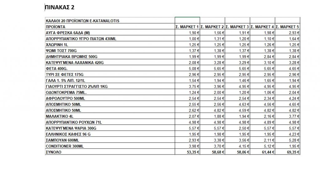 Στον πίνακα 2 της αναβαθμισμένης πλατφόρμας e-katanalotis παρακολουθούμε τη σύγκριση τιμών μεταξύ 5 διαφορετικών αλυσίδων ενός καλαθιού που περιλαμβάνει τα ίδια ακριβώς 20 προϊόντα.
