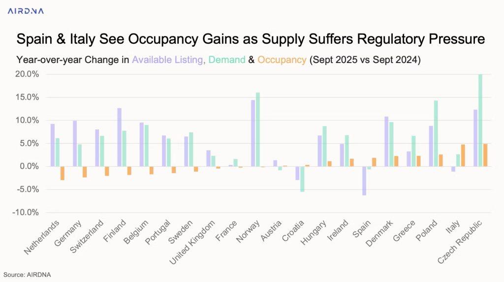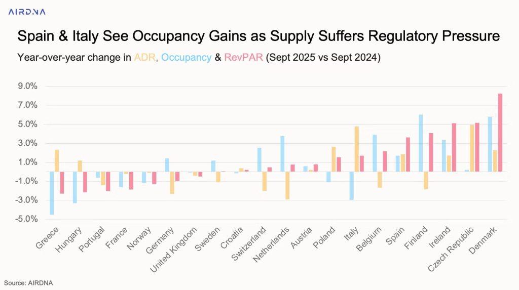 Η Ισπανία και η Ιταλία ξεχωρίζουν ως παραδείγματα όπου η μείωση της προσφοράς οδήγησε σε αύξηση της πληρότητας, με αποτέλεσμα μερικούς από τους υψηλότερους ρυθμούς αύξησης RevPAR στην Ευρώπη: +4% και +2% αντίστοιχα.