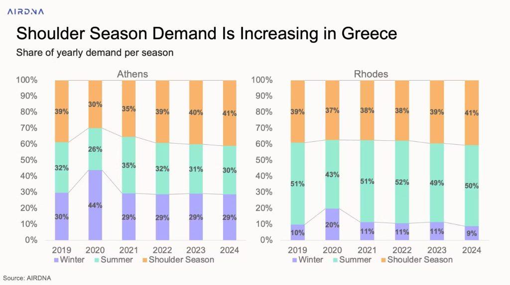 Η Ρόδος, που παραδοσιακά εξαρτάται από τα καλοκαιρινά ταξίδια, παρουσιάζει παρόμοιο μοτίβο. Η ζήτηση κατά τη διάρκεια των ενδιάμεσων μηνών αυξήθηκε από 39% το 2019 σε 41% το 2024, ενώ το μερίδιο του καλοκαιριού μειώθηκε από 51% σε 50%. Αν και ο χειμώνας εξακολουθεί να αντιπροσωπεύει μόνο το 9-11% των ετήσιων διαμονών, η τάση δείχνει ότι οι επισκέπτες επεκτείνουν τα ταξίδια τους πέρα από τους μήνες αιχμής.